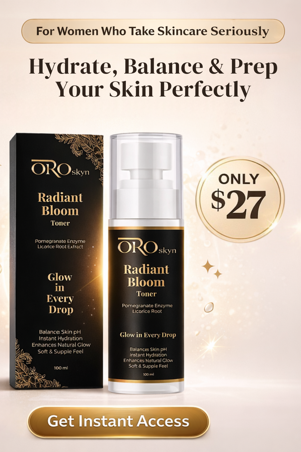 OROskyn Radiant Bloom Toner is designed to gently refresh and hydrate the skin while helping restore its natural pH balance after cleansing. Its lightweight, fast-absorbing formula revitalizes tired skin, leaving it soft, supple, and perfectly prepped for serums and moisturizers. With every application, the skin feels refreshed, balanced, and visibly luminous  the first step to a beautifully blooming complexion.